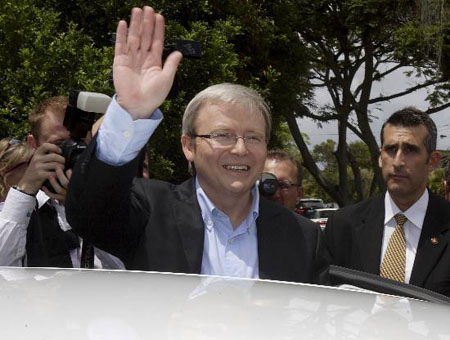 澳大利亞工黨領導人陸克文投票后離開投票站。新華社記者 張軍攝