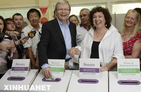 澳大利亞最大政黨工黨領導人陸克文與妻子在昆士蘭州首府布里斯班投票