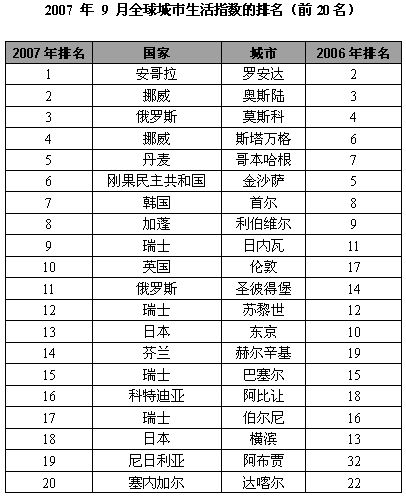 全球生活指數最高的城市是安哥拉的羅安達,緊隨其后的是挪威的奧斯陸和俄羅斯的莫斯科。亞洲地區的前十名分別是:首爾、東京、橫濱、神戶、香港、臺北、北京、上海、新加坡、廣州。