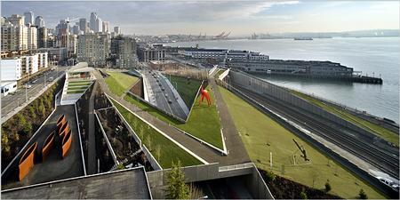 建筑師:韋斯/莫弗雷迪。西雅圖藝術博物館將其雕塑公園建于一個舊工業區內,一條繁忙的公路和鐵路穿越其間。