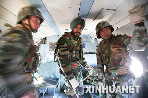 這是中印參演軍人搭乘武裝直升機進入演練地域。 新華社記者李剛攝