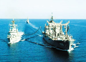 11月1日,因《反恐特別措施法》到期,日本宣布撤回部署在印度洋的海上自衛(wèi)隊(duì)艦艇。圖為10月29日,日本補(bǔ)給艦(右)為巴基斯坦驅(qū)逐艦加油。