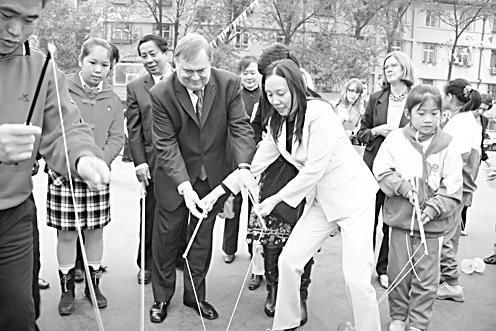 照片說明:英國副首相與白家莊小學部分師生一同抖起空竹。朝軒攝