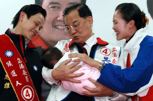 國民黨榮譽主席連戰(中)7日在臺北縣為“立委”候選人黃志雄(左)造勢,抱起黃志雄滿三個月的小女兒黃馨誼,提前體會當“連爺爺”含飴弄孫的樂趣。