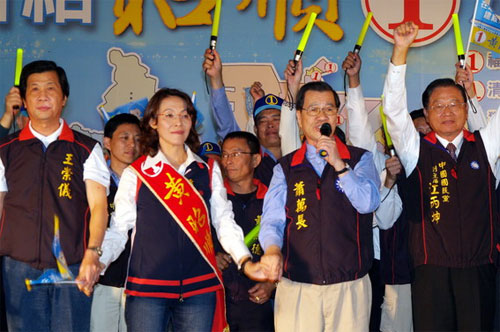 國民黨“立委”候選人黃昭順(前左二)8日在高雄市舉行“團結之夜”造勢晚會,國民黨副主席江丙坤(前右)和蕭萬長(前右二)一起站臺輔選。