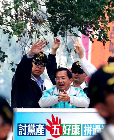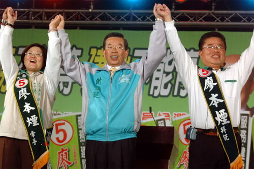民進黨大佬謝長廷(中)8日也在臺北縣樹林為民進黨“立委”候選人廖本煙(右)助選。