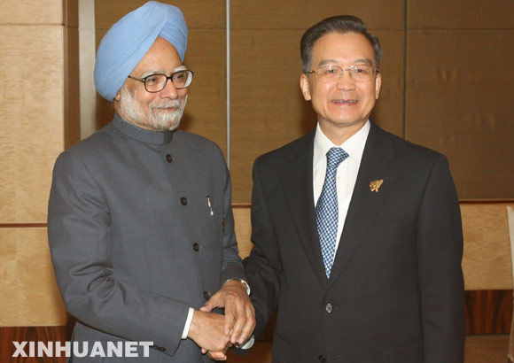 2007年11月21日,中國國務(wù)院總理溫家寶在新加坡會見印度總理辛格。 新華社記者樊如鈞攝