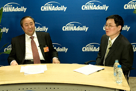 3月13日,文化部副部長周和平(左)接受《中國日報》專欄作家周黎明(右)采訪