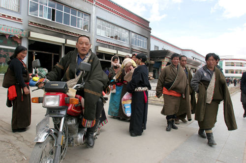 在經(jīng)歷了3月中旬的“打砸搶燒”事件后的瑪曲市民在縣城街頭享受著來之不易的安寧的生活。 攝影:中國日報記者 姜東