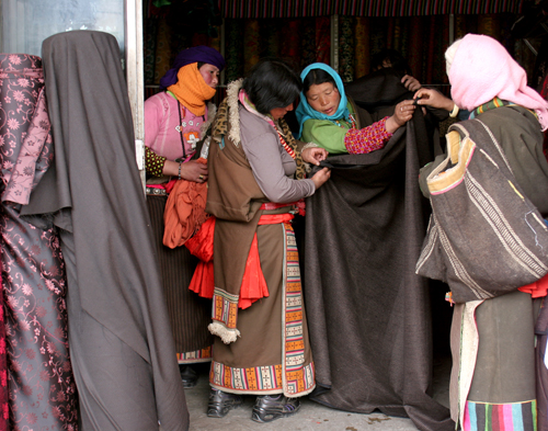 藏族婦女們在回民茍景春經(jīng)營的布料攤前挑選著自己喜愛的布匹。 攝影:中國日報記者 姜東