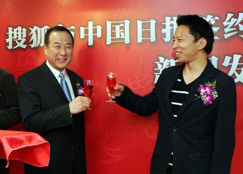 2008月4月18日,中國日報總編輯朱靈(左)與搜狐公司董事局主席兼首席執行官張朝陽舉杯祝賀中國日報與搜狐達成奧運戰略合作。[攝影:徐京星]