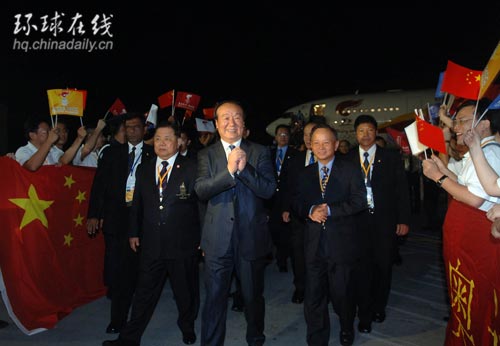 4月18日,北京奧組委執(zhí)行副主席蔣效愚一行在機場受到熱烈歡迎。當(dāng)日,運送北京奧運圣火的專機從印度新德里飛抵奧運火炬境外傳遞的第12站――泰國首都曼谷。 新華社記者公磊攝