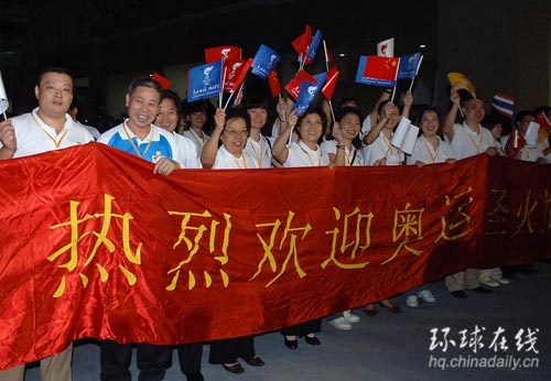4月18日,中國使館工作人員在機場熱烈歡迎奧運圣火的到來。當日,運送北京奧運圣火的專機從印度新德里飛抵奧運火炬境外傳遞的第12站――泰國首都曼谷。 新華社記者公磊攝