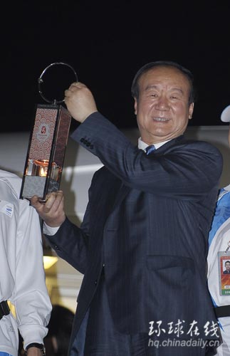4月18日,北京奧組委執行副主席蔣效愚手捧火種燈走出機艙。當日,運送北京奧運圣火的專機從印度新德里飛抵奧運火炬境外傳遞的第12站――泰國首都曼谷。 新華社記者戚恒攝