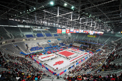 國家體育館是北京奧運會的新建場館,是奧林匹克中心區(qū)標志性建筑之一。體育館屋頂曲面近似扇形,如行云流水般飄逸又富于動感,四周豎立的鋼骨架與大面積晶瑩剔透的玻璃幕墻相映襯,猶如一把張開的中國扇,彰顯出中國文化的內涵。