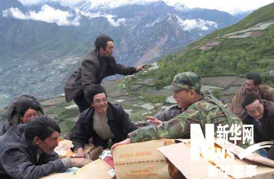 士兵在投送食品和水等救援物資,5月14日上午10時30分,[新華社記者徐壯志攝]