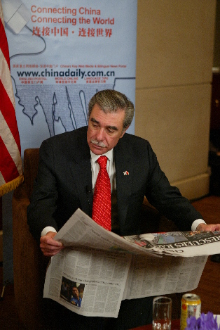 5月14日晚7點,正在中國訪問的美國商務部長古鐵雷斯在北京接受了《中國日報》總編輯助理劉式南的專訪。圖為古鐵雷斯在閱讀《中國日報》。