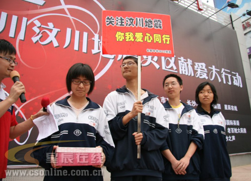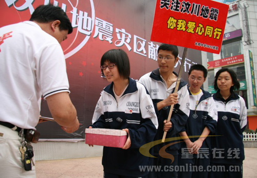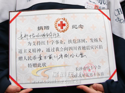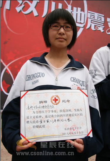 這是長郡中學0612班的學生,他們用自己的零用錢和在街上募捐來的錢,支援災區人民