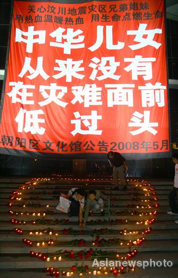 2008年5月15日,北京朝陽區(qū)文化館,一名志愿者手捧蠟燭默默祈禱。當(dāng)天,朝陽文化館前懸掛起巨幅布掛,在“中華兒女從來沒有在災(zāi)難面前低過頭”畫布下,捐款群眾用蠟燭擺成“心”形為四川震災(zāi)群眾祈求平安。