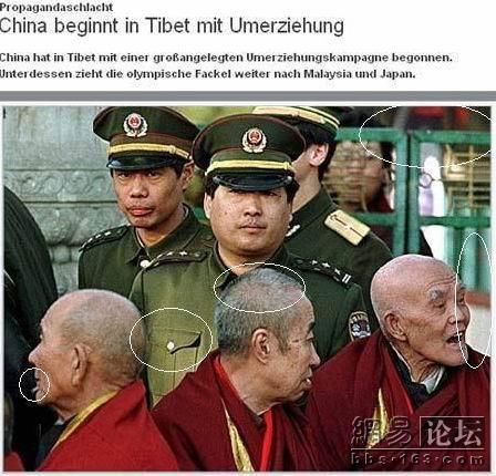 中國日報網環球在線消息:今年4月下旬,德國N24電視臺在其網站上發表一組題為“宣傳戰——中國在西藏開始思想改造運動”的新聞,刊登了一張中國警察和喇嘛在一起的照片,照片下寫道:“中國警察在北京監視藏族喇嘛的儀式活動”,網頁上注釋這張照片來自美聯社。一些專家認為,這是一張幾年前的舊照片,而且這張照片是由兩幅以上的照片經過技術處理合成的。