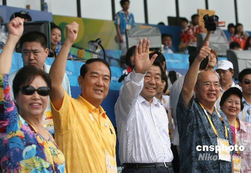 8月13日,北京奧運會棒球比賽揭幕戰在中華臺北隊和荷蘭隊之間舉行,中共中央政治局常委、全國政協主席賈慶林與中國國民黨主席吳伯雄、親民黨主席宋楚瑜到現場觀戰,共同為中華臺北棒球隊加油。中新社發武仲林 攝