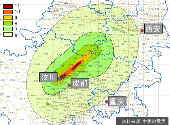 Ⅺ度區(qū):面積約2419平方公里,以四川省汶川縣映秀鎮(zhèn)和北川縣縣城為兩個(gè)中心呈長(zhǎng)條狀分布,其中映秀Ⅺ度區(qū)沿汶川-都江堰-彭州方向分布,長(zhǎng)軸約66公里,短軸約20公里,北川Ⅺ度區(qū)沿安縣-北川-平武方向分布,長(zhǎng)軸約82公里,短軸約15公里。