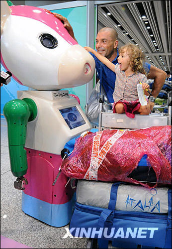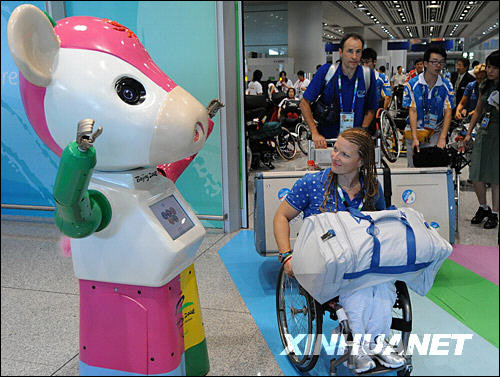 9月2日,“福牛樂樂”機(jī)器人在機(jī)場迎候參加殘奧會的外國運(yùn)動員。