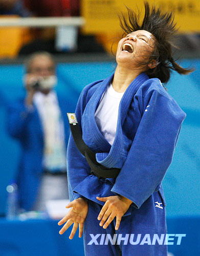 9月7日,中國選手崔娜慶祝勝利。當日,在北京工人體育館舉行的北京2008年殘奧會女子柔道52公斤級決賽中,崔娜擊敗法國選手桑德里娜·奧里埃—馬蒂內,獲得冠軍。新華社記者廖宇杰攝