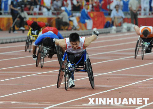 9月10日,中國選手張立新在比賽中角逐。在北京2008年殘奧會男子400米T54級決賽中,張立新以45秒07的成績奪冠并打破世界紀錄。新華社記者陳樹根攝