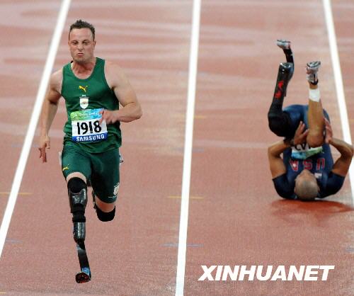 9月9日,南非選手皮斯托瑞斯(左)在比賽中沖向終點。當(dāng)日,在國家體育場進行的北京2008年殘奧會男子100米T44級決賽中,有“刀鋒戰(zhàn)士”之稱的南非著名殘疾人運動員皮斯托瑞斯以11秒17的成績奪得冠軍。新華社記者李文攝