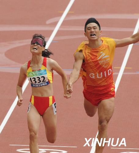 9月9日,中國選手吳春苗(左)與領(lǐng)跑員在比賽中。當(dāng)日,在國家體育場進行的北京2008年殘奧會女子100米T11級決賽中,吳春苗以12秒31的成績奪得冠軍。新華社記者李文攝