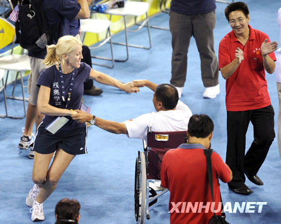 9月14日,觀看北京2008年殘奧會(huì)女子坐式排球比賽的一位美國(guó)女觀眾和一位中國(guó)殘疾人觀眾在場(chǎng)外手牽手跳舞。新華社記者戴旭明攝