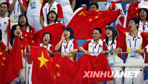 9月15日,中國隊成員為參賽選手助威。當日,在國家游泳中心——“水立方”進行的北京2008年殘奧會游泳比賽收官。至此,“水立方”送走了北京奧運會與北京殘奧會,完美謝幕。新華社記者凡軍攝