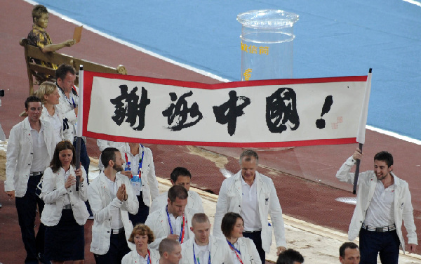9月17日,英國代表團舉著“謝謝中國”的橫幅進場。 當日,北京2008年殘奧會閉幕式在國家體育場“鳥巢”舉行。 新華社記者韓傳號攝