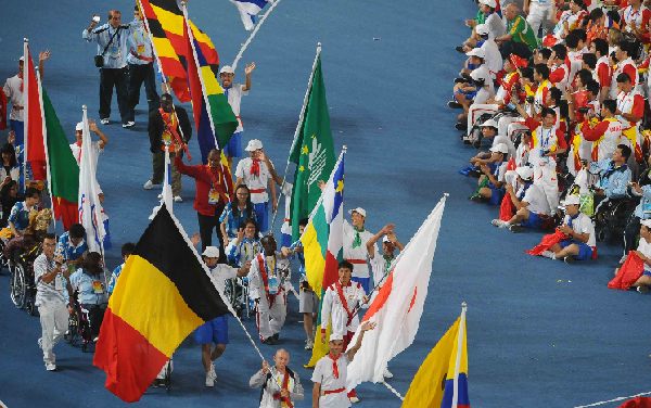 9月17日,各代表團(tuán)旗幟入場(chǎng)。當(dāng)日,北京2008年殘奧會(huì)閉幕式在國(guó)家體育場(chǎng)進(jìn)行。 新華社記者郭大岳攝