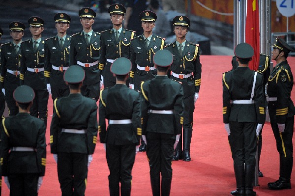 9月17日,北京2008年殘奧會(huì)閉幕式在國(guó)家體育場(chǎng)即將舉行。這是閉幕式前升旗手準(zhǔn)備升旗。 新華社記者劉大偉攝