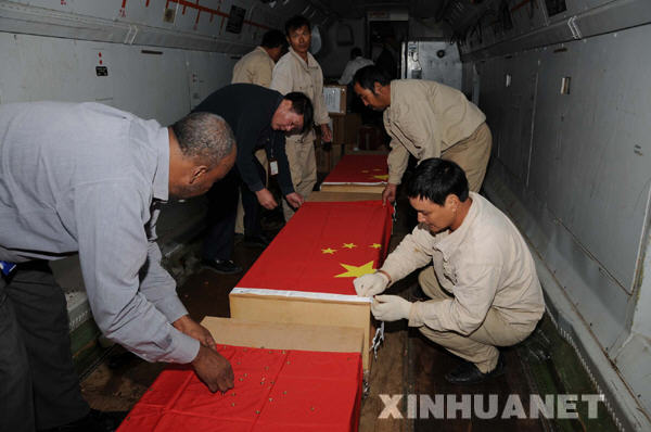 10月28日晚,3名遇害中國工人的棺材被抬下飛機之前,工作人員給棺材蓋上中國國旗。當晚,在蘇丹西南部地區被綁匪殘忍殺害的3名中國工人的遺體被專機運到喀土穆。新華社記者邵杰攝