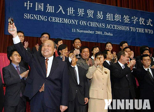 2001年12月11日,中國正式加入世界貿易組織,成為其第143個成員。圖為2001年11月11日,中國外經貿部部長石廣生在卡塔爾首都多哈舉行的中國加入世貿組織議定書簽字儀式上舉杯慶賀。新華社發