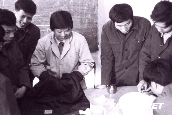 攝影部記者在學習使用暗袋和顯影罐沖洗膠片(攝于上世紀80年代初)。新華社記者 楊嘉理 攝