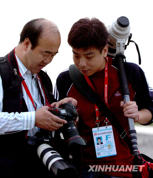 新華社攝影記者在南京賽馬場采訪時一起觀看數碼相機拍攝的照片(2005年10月17日攝)。新華社發