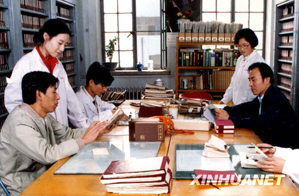 新華社攝影部編輯在查找照片資料(攝于上個世紀90年代)。新華社發(資料照片)