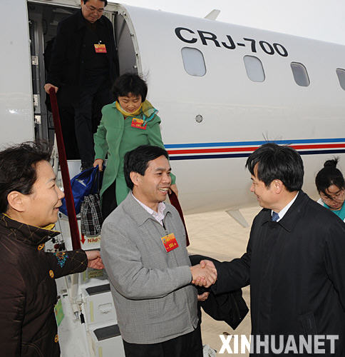 2月28日,廣西壯族自治區出席全國政協十一屆一次會議的全國政協委員乘飛機抵達北京西郊機場。 新華社記者黃敬文攝