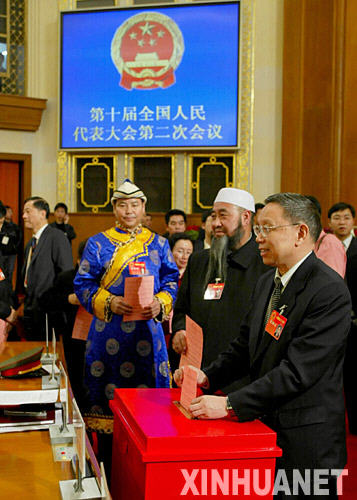 這是2004年3月14日,出席十屆全國人大二次會議的代表們投票表決中華人民共和國憲法修正案草案。會議審議通過的憲法修正案將“三個代表”重要思想、尊重和保障人權、保護合法私有財產等內容寫入憲法,充分體現以人為本理念。新華社發
