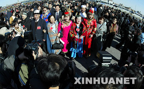 這是2003年3月3日,參加全國政協十屆一次會議的少數民族委員步入會場,引來眾多記者采訪。 新華社發