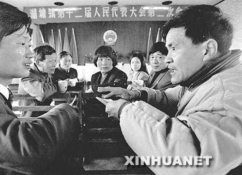 這是1997年4月,浙江省紹興市政協委員胡世慶(右一)在列席家鄉湖塘鎮人大會議時呼吁大力加強農村精神文明建設。新華社發