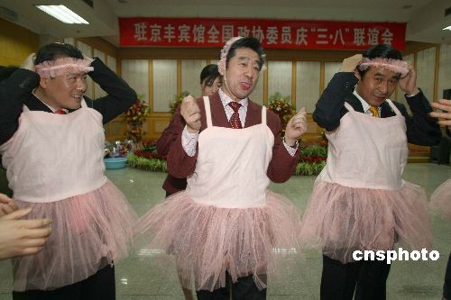 3月6日晚,全國政協委員在駐地舉行迎接“三·八”婦女節聯歡會,三位男性政協委員也參加其中,裝扮成小天鵝向女政協委員表示節日祝賀。中新社發盛佳鵬 攝