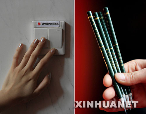 右圖:人民大會堂供會議使用的、以廢舊報紙為原料制造的鉛筆(3月10日攝)。新華社記者尹棟遜攝