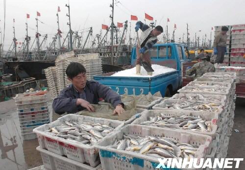 這是2005年4月20日,漁民在山東省榮成市石島港卸載剛捕撈的黃魚。 新華社發(fā)(來源:新華網(wǎng))
