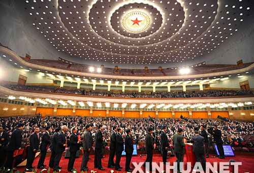3月13日,全國政協十一屆一次會議在北京人民大會堂舉行第四次全體會議,選舉十一屆全國政協主席、副主席、秘書長和常務委員。這是委員們排隊投票。新華社記者蘭紅光攝