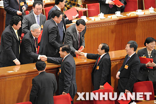 3月13日,全國政協十一屆一次會議在北京人民大會堂舉行第四次全體會議,選舉十一屆全國政協主席、副主席、秘書長和常務委員。這是賈慶林當選政協第十一屆全國委員會主席后,委員們向他表示祝賀。新華社記者宋振平攝